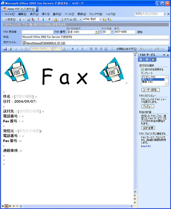 本機能のサポートにより、Microsoft Office 2003アプリケーションのファイルメニューから「インターネットFAXサービスを使用する宛先」を選ぶことで、アプリケーションから直接FAX送信をおこなうことができます。次の画面は、メニュー選択後に表示されるFAX送信画面です。