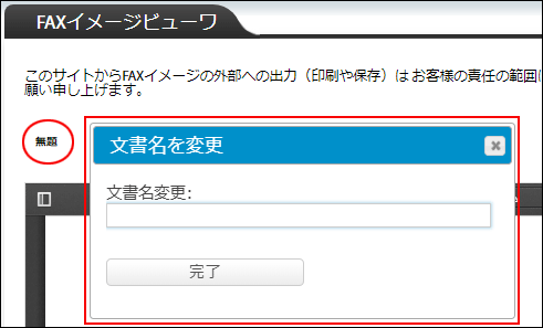 FAXイメージビューワ左上の「無題」部分をクリックすると「文書名変更」のポップアップウィンドウが表示され、FAX文書の名前の登録、変更ができます。(文書名を登録済みの場合は、その文書名が表示されます。)