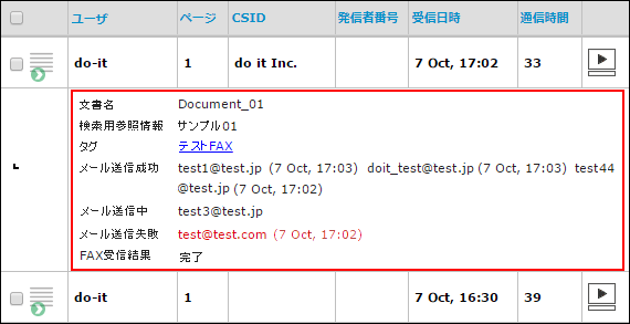 メール送信が失敗した受信FAX転送メールアドレスと日時が赤字で表示されます。