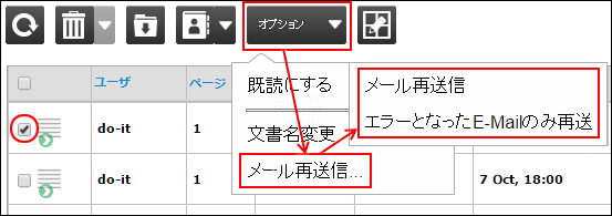まず、受信履歴の左側のボックスにチェックを入れ、オプションアイコンから「メール再送信...」をクリックすると2つの選択画面が表示されます。