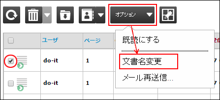 まず、文書名を登録したい受信履歴左のボックスにチェックを入れ、オプションアイコンから「文書名変更」を選択します。(既に登録している文書名を変更する場合もここから変更が可能です。)