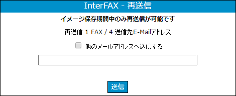 次に「メール再送信」、「エラーとなったE-Mailのみ再送」のいずれかをクリックすると「InterFAX−再送信」のポップアップウィンドウが表示されます。