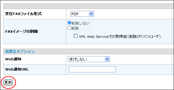 高度なオプション設定(受信FAXファイル形式、FAXイメージの削除)