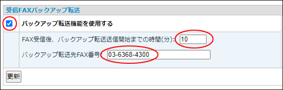 FAX受信する「転送アドレス(登録済みメールアドレス)」に何らかの問題が発生し、指定した時間(分)以内にメール送信ができない場合、指定したFAX番号へ受信したFAXを送信いたします。