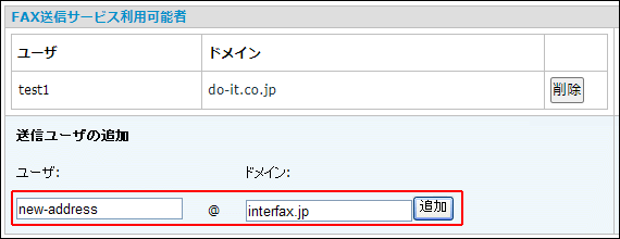 ユーザを追加する場合は、「送信ユーザの追加」下部のボックスにメールアドレスを入力し、「追加」ボタンをクリックします。追加されると「FAX送信サービス利用可能者」に表示されます。